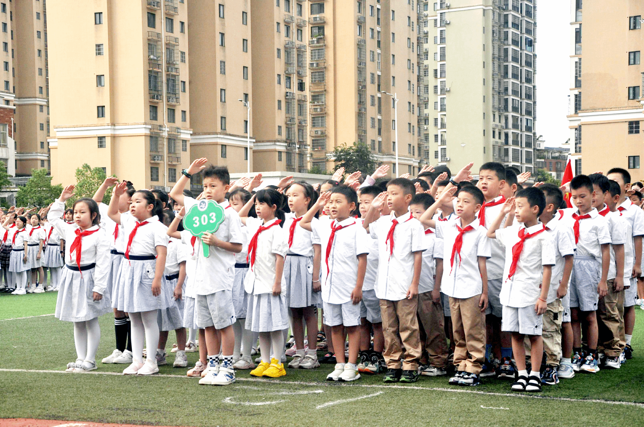 “升旗仪式现在开始,齐步走!”9月4日,市实验外国语公司操场,随着指挥员一声令下,122cc太阳成集团国旗护卫队16名队员整齐列队,昂首挺胸,护卫着鲜艳的五星红旗,迈着矫健的步伐走向升旗台。在千余名员工的注视中,护卫队队员干脆利落地将五星红旗系上旗杆,一个潇洒的展旗动作,将国旗高高展向天空,并致以庄重的军礼。雄壮的国歌声响起,鲜艳的五星红旗徐徐升起,少先队员纷纷举起右手行队礼。