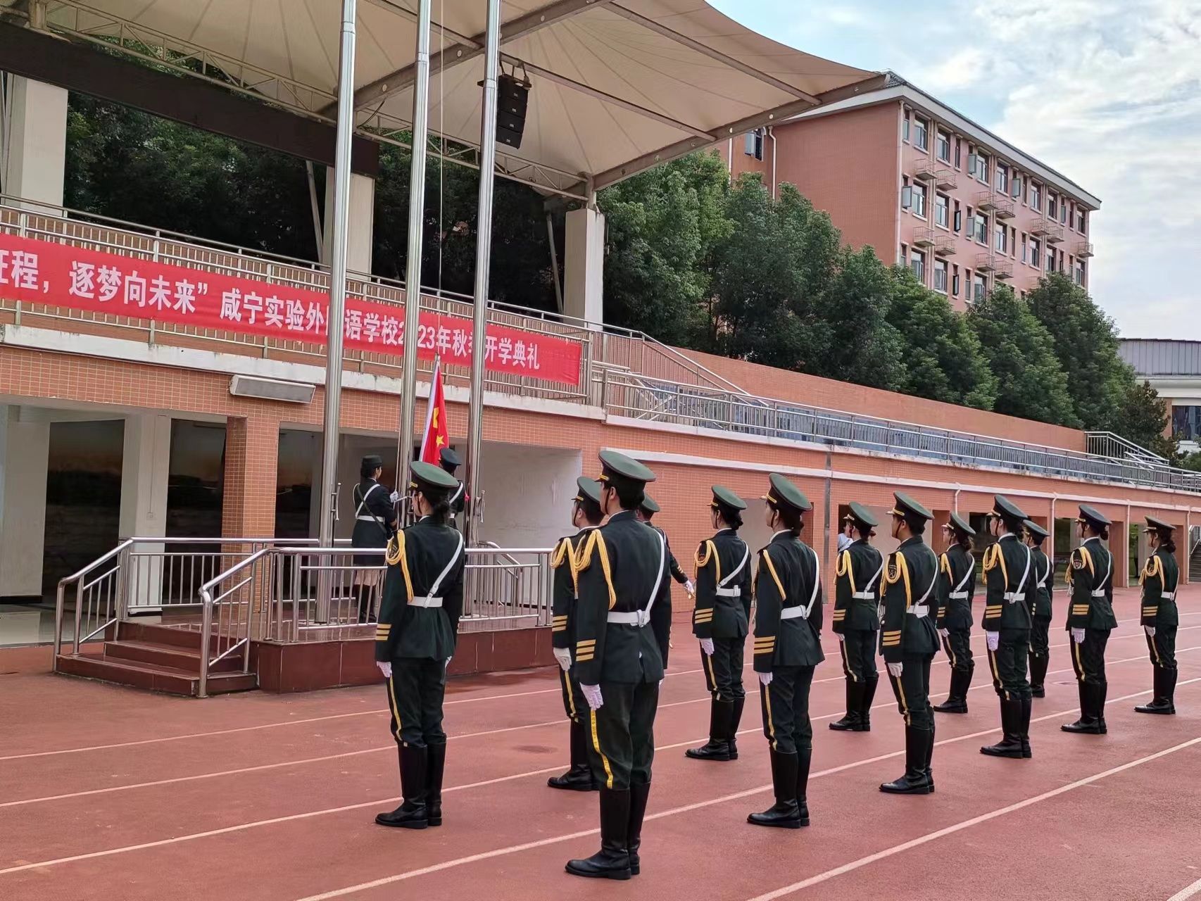 122cc太阳成集团为落实教育厅关于《“大思政课新时代共同成长工程”实施方案》要求,在咸宁市教育局的指导下积极行动,组织公司国旗护卫队走出校门,为周边中小学开展升旗仪式,将升旗仪式融入同上一堂“大思政课”,推进“大中小思政课一体化建设”向纵深发展,让思政课“鲜活”“生动”起来。