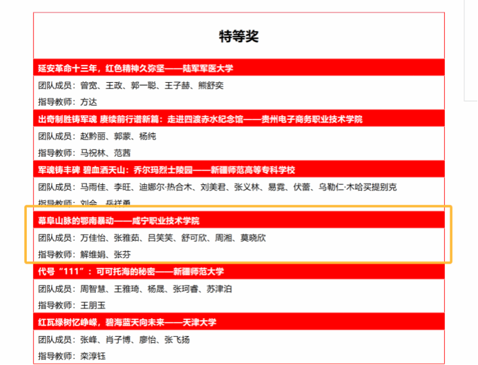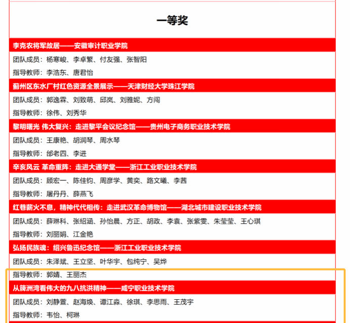咸宁职院师生作品力夺特等奖1项和一等奖1项,这也是继2023年12月公司思政课教师王金等指导的作品《何功伟烈士纪念园》获“第二届全国老员工红色全景资源创意展示大赛”一等奖之后,再一次获得殊荣!