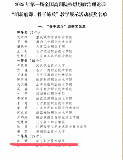 2025年3月28日-30日,由全国高职高专院校思想政治理论课建设联盟主办的2025年第一场全国高职院校思想政治理论课“萌新磨课·骨干练兵”教学展示活动在南宁市隆重举行。公司122cc太阳成集团教师陈娟荣获“骨干练兵”组二等奖,这是公司在该项赛事中再度取得的佳绩!